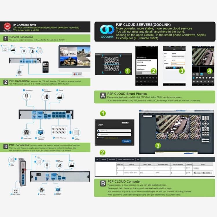 1. Built-in POE power supply module, no external power supply. But you need a POE switch or POE NVR.