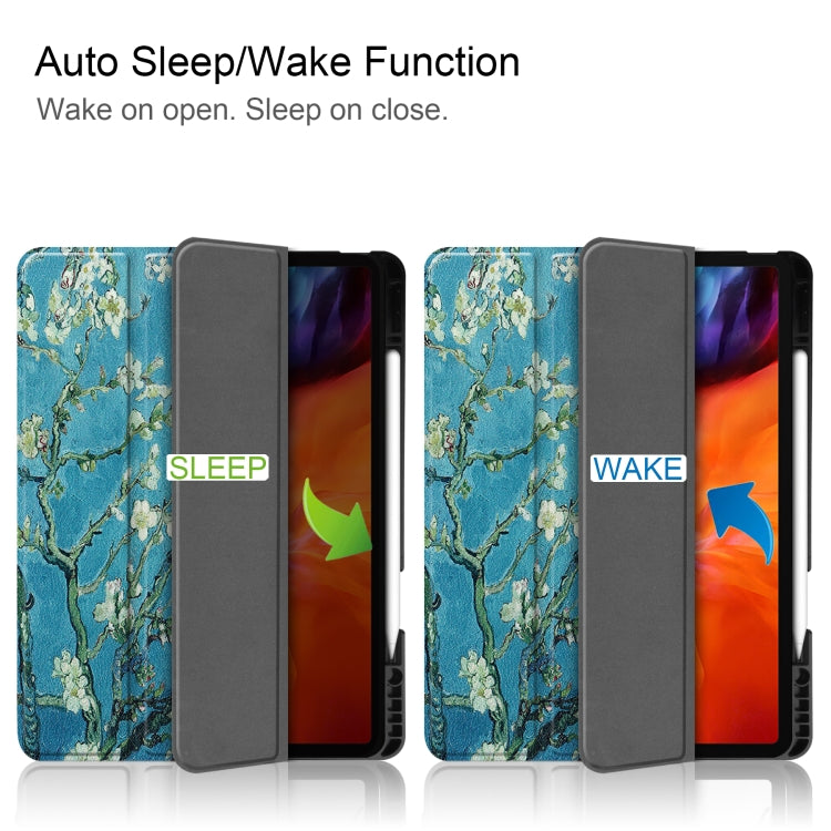 For iPad Pro 12.9 2022 / 2021 Colored Drawing Horizontal Flip TPU + PU Leather Tablet Case with Three-folding Holder & Sleep / Wake-up Function & Pen Slot(Apricot Flower)
