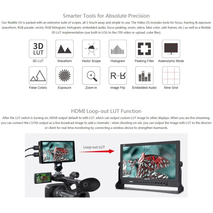10. With Waveform, Vectorscope, RGB Histogram, Focus Assist,Monochrome etc. functions, help you accurately exposure and focus every shot.