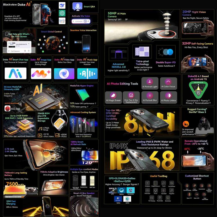 Blackview BL7000 Rugged Phone, 8GB+256GB, 6.78 inch Android 15 MediaTek Dimensity 6300 Octa Core, Network: 5G, NFC, OTG (Black)