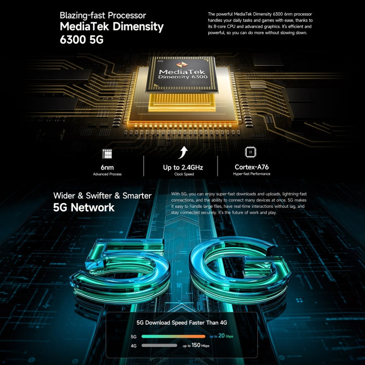 1. CPU: MediaTek Dimensity 6300, octa-core, 2.4GHz, 2 x Arm Cortex-A76, 6 x Arm Cortex-A55