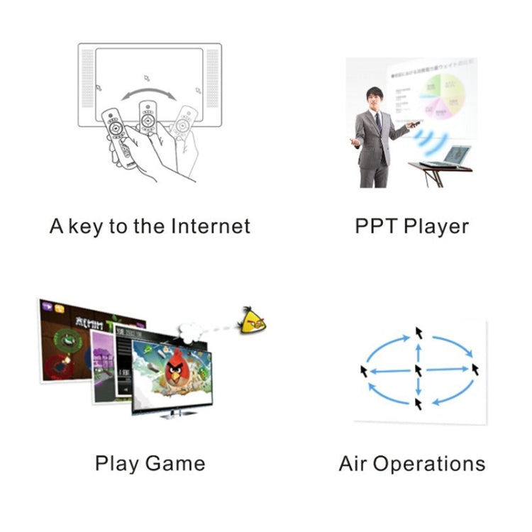 6. It contains air mouse function, uses the gravity induction positioning, you do not need to sit in front of the podium permanent to operate computer, can easily switch over different files and play lists, embody wireless click, unlimited communication.