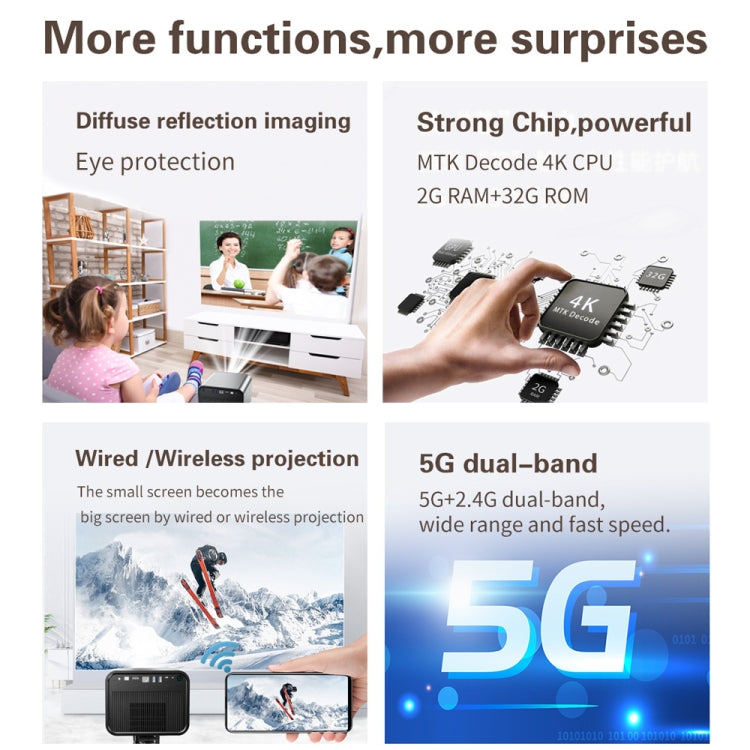 1. 2200ANSI + 0.47 inch DMD optical machine, bright and vivid, the picture is transparent and pure, no fear of daylight, white wall direct projection is also clear