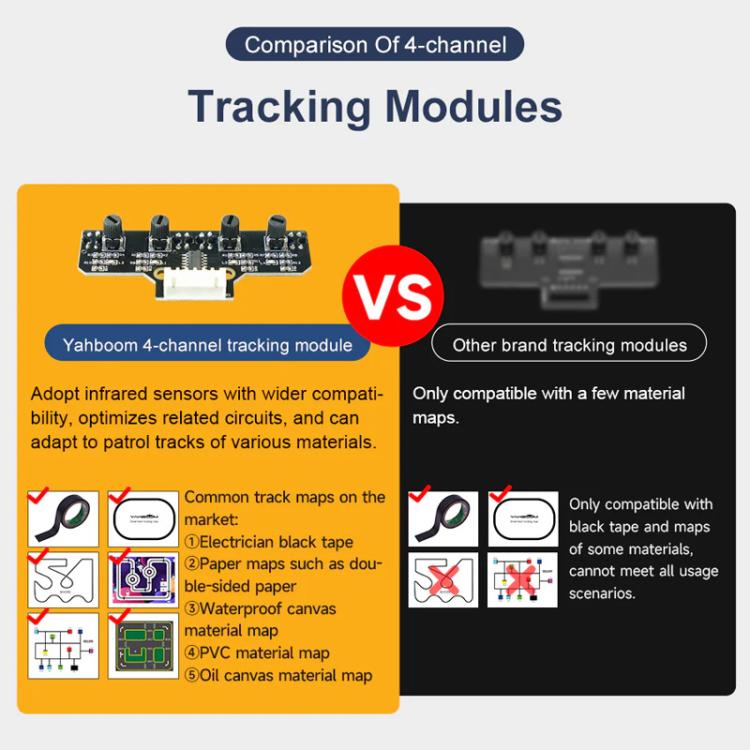 1. This tracking module uses four tracking probes and optimizes the spacing layout. The two inner probes can precisely identify the black lines, while the two outer probes can assist the inner probes in identifying the black lines and provide warnings. The vehicle can recognize 90-degree turns and other complex road surfaces.