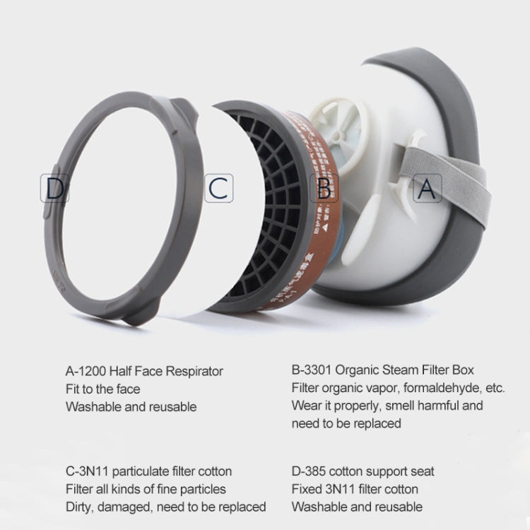4.1200 half mask: TPE material, comfortable to wear, safe and odor-free, healthy and environmentally friendly. Only 53 grams, suitable for long-term use. The snap-on design facilitates the installation and removal of the filter cartridge. The unique exhalation valve has a large opening range, exhales hot and humid breath, makes the air inside the mask fresher and exhales smoothly, and can adjust the head frame to be elastic, safe and reliable, and provide comfortable wearing.