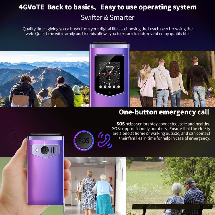 HAMTOD T8 4G Flip Phone, EU Version, 2.8 inch + 1.77 inch, VoLTE, BT, SOS, OTG(Purple)
