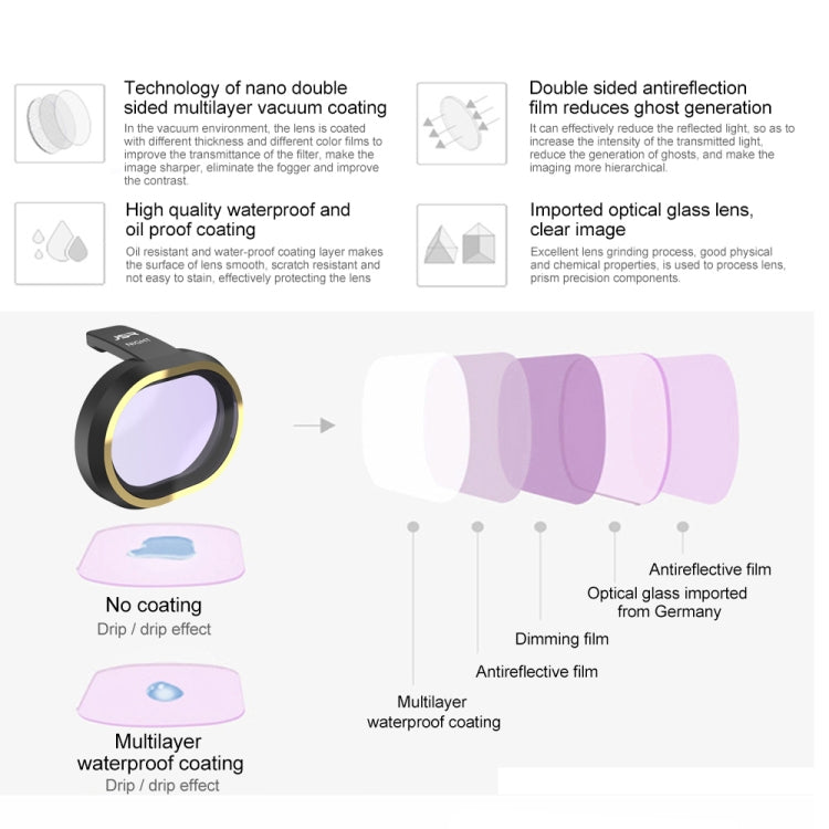 2. ND filters washed out photos & video due to bright sunlight for better contrast & rich color. Significantly reduce lens flare and ghosting while making the filter anti-scratch, reduce reflection, increase surface durability, water resistant, oil & dust resistant.