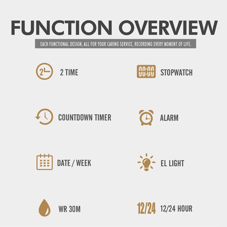 5. Functions: time, stopwatch, date, alarm clock, EL luminous light, hourly time chime, 12/24 hour format, countdown